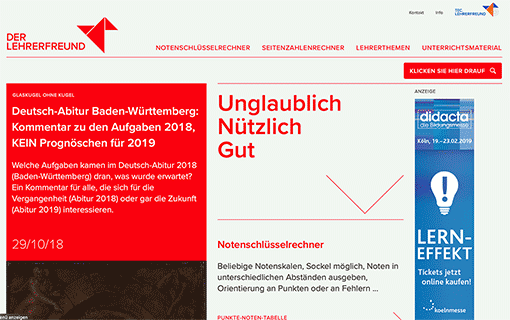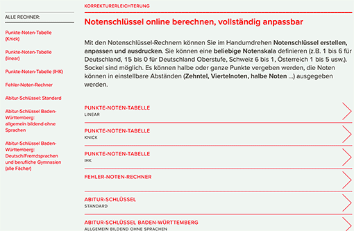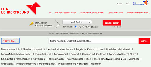 Seit der letzten großen Neugestaltung wurden einige Bereiche verbessert und Der Lehrerfreund noch komfortabler gemacht. Eine wichtige Neuerung war der Einbau eines Notenschlüsselrechner-Widgets im oberen Bereich des Layouts, so dass nun von jeder Seite aus direkt ein linearer Notenschlüssel berechnet werden kann: