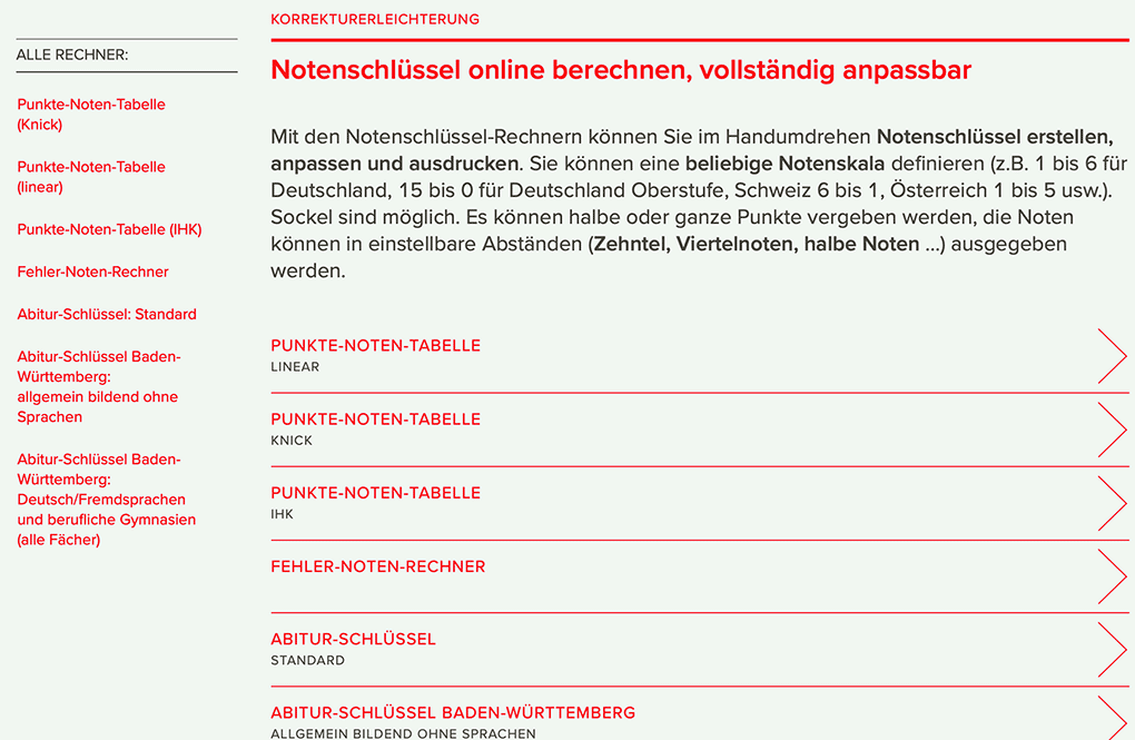 Screenshot: Notenschlüsselrechner Übersichtsseite