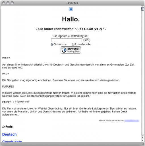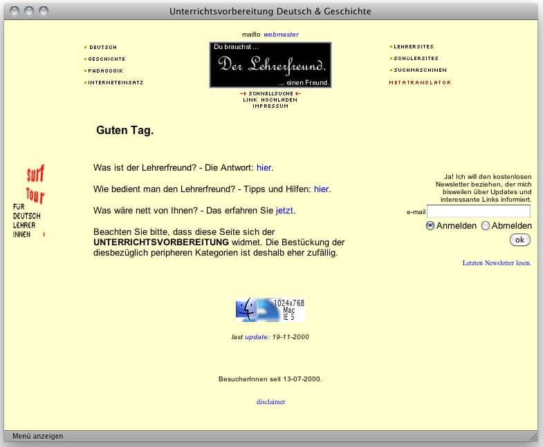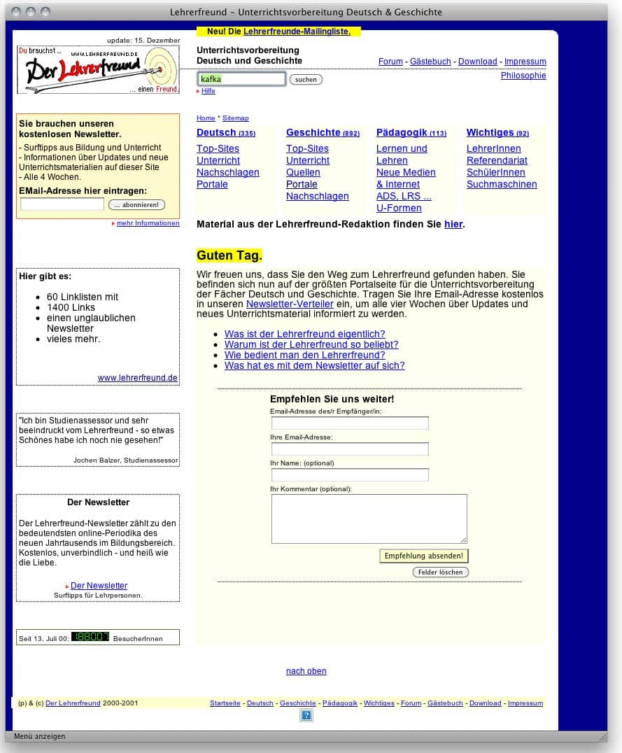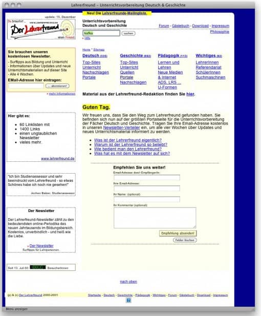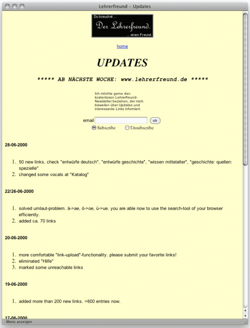 Der erste Lehrerfreund bestand anfänglich neben Marginalien wie Impressum, Update-Log usw. aus einer einzigen, riesigen Seite, auf der durch Anchor-Links (Sprung-Links innerhalb der Seite) navigiert wurde. Der obere Teil dieser Seite: