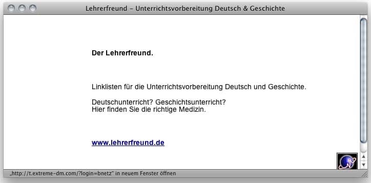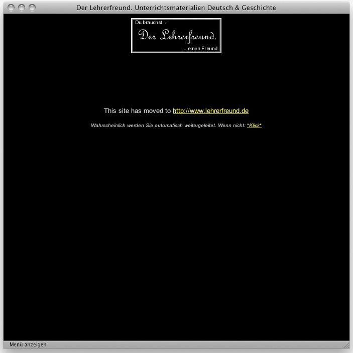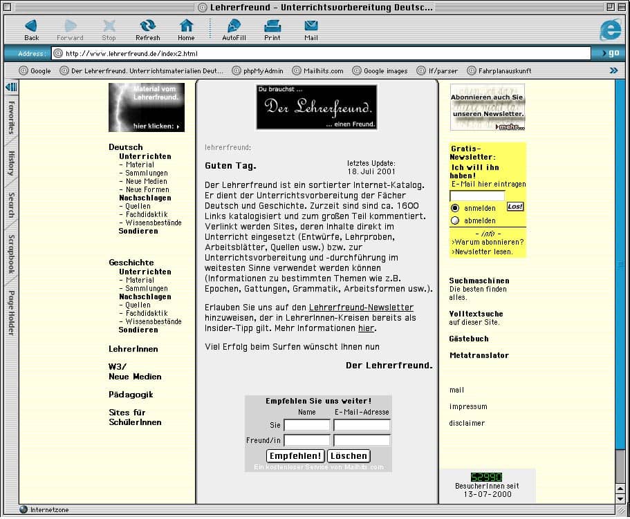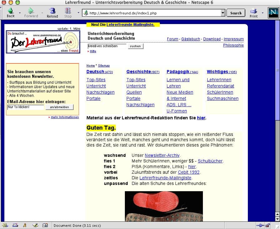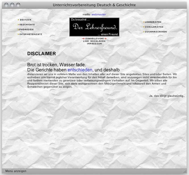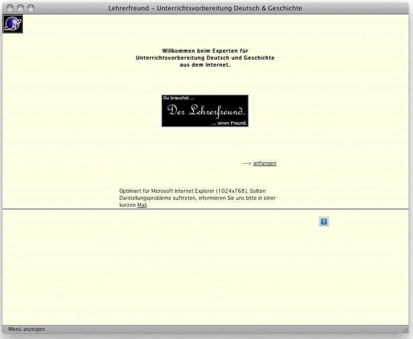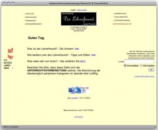 Das war auch der erste Lehrerfreund, der mit einer “Splash-Page” arbeitete - eine dem Webauftritt vorgeschaltete Einzelseite, die die unerfahrenen Benutzer/in schonend auf das folgende üppige Angebot einstimmen sollte: