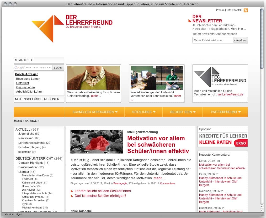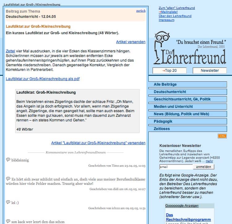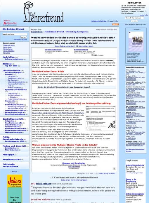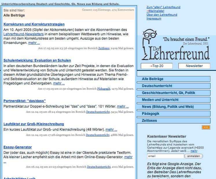 Zu diesem Zeitpunkt hatte Der Lehrerfreund mehr als 60 kommentierte Linklisten mit insgesamt 1.400 regelmäßig aktualisierten Links. Viele Anhänger gewann Der Lehrerfreund damals durch seine kompromisslose Text- und Bildverwendung: