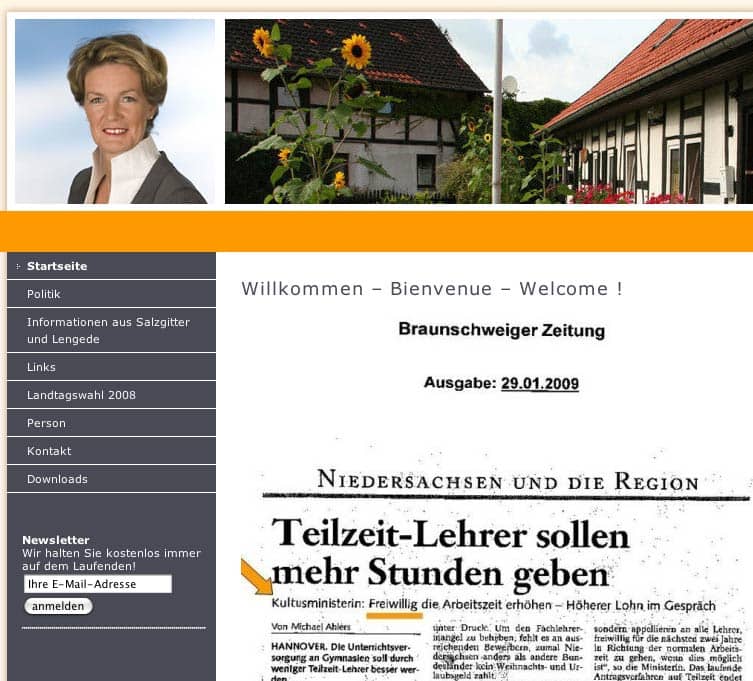 Warum, um Gottes Willen, will sie sie bei unterirdischen Bezügen (deutlich unter 1000 Euro/Monat) voll arbeiten lassen und nicht anständig bezahlen? Offensichtlich ist ihr nicht klar, dass auf dem Lehrerakquirierungsportal Baden-Württembergs drei Klicks genügen, und die Leute sind weg. Sei’s drum - Ministerpräsident Christian Wulff (CDU) wird die Verblendete demnächst opfern müssen, denn auch die (ursprünglich von ihm vertretene) Idee des “freiwilligen Verzichts” auf Teilzeit kommt im Volk nicht gut an. Da helfen auch nicht verzweifelte Hinweise auf der Homepage der Ministerin (Screenshot).