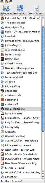 Die meisten Weblogs (oder “Blogs”) bieten ihre Beiträge nicht nur als Browserseiten im WWW an, sondern auch als “Newsfeed”. Das sind Formate, die mit einem sogenannten “Feedreader” (oder inzwischen auch von dem meisten E-Mail-Programmen) gelesen werden können. So bleibt gerade bei großen Newsmengen der Überblick erhalten, und man muss nur die Seiten im WWW betrachten, die einen auch tatsächlich interessieren. Alle vorgestellten Seiten bieten einen RSS-Feed an oder verarbeiten andere RSS-Feeds.