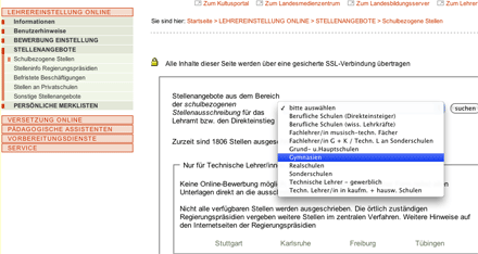 Nach NRW hat nun auch Baden-Württemberg das Einstellungsverfahren für Lehrer/innen vorgezogen; ab sofort kann man sich online auf mehr als 1.800 Stellen (Stand: 20.11.2008) bewerben.