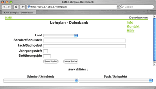 Die Lehrplandatenbank der Kultusministerkonferenz (kmk.org) bedient sich etwas statisch, funktioniert aber in den meisten Fällen ganz gut. Gönnen Sie der Datenbank etwas Wartezeit. Ist sie mal wieder abgeschmiert und konfrontiert Sie mit Fehlermeldungen, probieren Sie es am besten einen Tag später noch einmal.