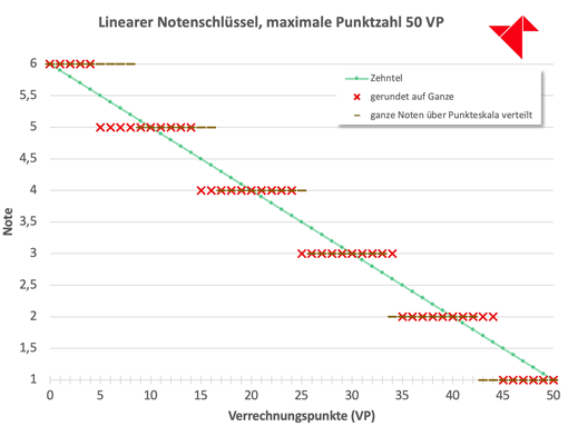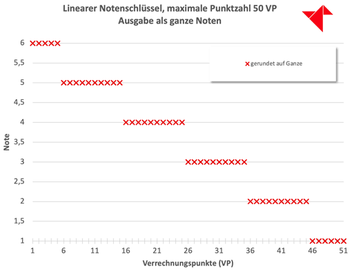 So funktioniert unser linearer Notenschlüssel, wenn man die Ausgabe auf ganze, halbe oder Viertelnoten festlegt. Dann wird nämlich mathematisch korrekt gerundet und nicht verteilt. Dies führt manchmal zu Unklarheiten, die wir hiermit beseitigen.
