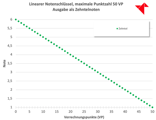 Der lineare Notenschlüsselrechner vom Lehrerfreund funktioniert in der Basisversion so: Sie geben eine Maximalpunktzahl ein und erwarten eine lineare Verteilung über die ganze Notenskala. Wir verwenden im Folgenden als Beispiel die deutsche Notenskala von 1 (beste Note) bis 6 (schlechteste Note) und 50 maximal zu erreichende Verrechnungspunkte (VP).