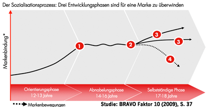 In der Orientierungsphase “ist der Zugang für Marken zu den Jugendlichen leicht und sollte genutzt werden.” (S. 37). In der Abnabelungsphase (Pubertät) müssen die Marken “dauerhaft in den Köpfen verankert” werden (S. 39). In der abschließenden selbstständigen Phase haben sich die “Markenbeziehungen gefestigt” (S. 41).