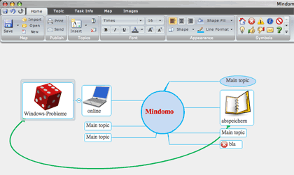 Die applikative Seite von Web 2.0 in Reinform: Man besucht die Website Mindomo und kann sofort anfangen, eine Mindmap zu erstellen. Anordnungen, Formen, Farben, zusätzliche Verbindungen usw. sind relativ frei veränderbar, es gibt eine Hand voll Cliparts und Icons, einen (etwas rudimentären) Aufgabenmanager usw.