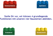 René Scheppler, Triebwerk des D21-Projektblogs, erklärt in der Slideshare-Präsentation “Moodle erklärt mit Lego” anschaulich, was Moodle konkret kann. Die wesentlichen Arbeitsmöglichkeiten von Moodle werden mit der Legosteinmetapher dargestellt: Auf einer Grundplatte werden Fundamente (“Kurse”) angebracht, die jeweils mit beliebigen Legosteinen (“Module”, “Plugins”, “Ressourcen” etc.) bestückt werden. All diese wiederum können (nach Scheppler) vier “Funktionen” ausüben: “kommunizieren”, “speichern” [sowohl L als auch S], “evaluieren” und “kollaborieren”. Ergänzend sei angemerkt, dass einzelne Komponenten von Moodle auch mehrere Funktionen haben können; durch ein Forum können alle vier Funktionen gleichermaßen und gleichzeitig ausgeübt werden.