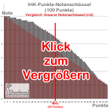 Die Verteilung der Noten richtet sich nach dem IHK-Punkt- und Notenschlüssel, wo meist von einer 100-Punkte-Skala ausgegangen wird. Der IHK-Schlüssel ist nicht linear (siehe Bild rechts) und wesentlich strenger als ein linearer Noten-Punkte-Schlüssel.
