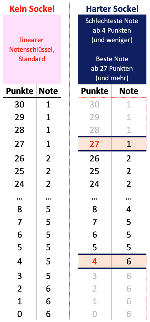 Ein harter Sockel ist genau definiert. "Bei 4 Verrechnungspunkten (und weniger) gibt es eine 6.", oder: "Die 1 vergebe ich bei 27 Verrechnungspunkten (und mehr)." Das bedeutet, dass der auf den Sockel folgenden Punktzahl zwingend der nächste Notenschritt zugeordnet ist. Wenn Sie also nur ganze Noten vergeben und ab 4 Punkten die 6 (schlechteste Note) vergeben, dann folgt bei 5 Punkten zwingend die Note 5.