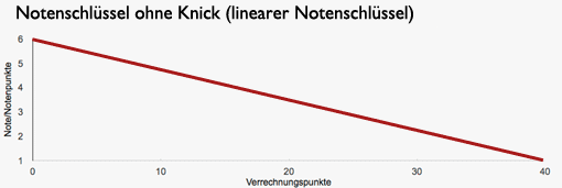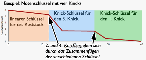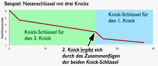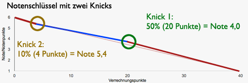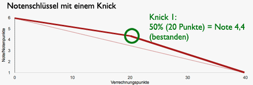 Notenschlüssel mit einem Knick werden ziemlich häufig verwendet, wenn man festlegen möchte, wo die Grenze zum Bestehen der Arbeit liegt. Hier sollte man überlegen, ob man die Note "ausreichend" (4,0) als Grenze definiert oder die Noten 4,4. Beim deutschen Oberstufenpunktesystem ist das einfacher, da 5 Punkte noch als "bestanden" gilt, 4 Punkte schon als mangelhafte Leistung.
