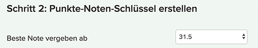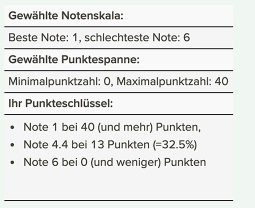 - Skalenberechnung: Wünschen Sie eher die Angabe der Minimal- und Endpunktzahl Ihrer Notenskala ("maximal erreichbare Punktzahl: 100 Verrechnungspunkte") oder möchten Sie bestimmen, ab welcher Punktzahl eine bestimmte Note vergeben wird ("Ich möchte ab 100 Verrechnungspunkten eine 1.0 geben."). Dieses Problem ist diffiziler, als es auf den ersten Blick scheint.