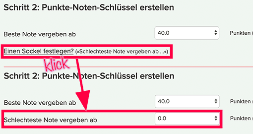 Bei den Punkte-Noten-Schlüsseln und dem Fehlerschlüssel können Sie einen Sockel einstellen (siehe z.B. hier: Praxistipp: Notenschlüssel anpassen mit Sockel und/oder Knick). Diese Einstellung hat manche Leser/innen verwirrt, die einfach die Maximalpunktzahl der Punkteskala einstellen wollten und sonst nichts.