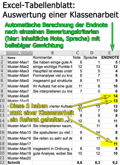 Die folgenden Ausführungen setzen voraus, dass Sie einfache Notenberechnungen in Excel durchführen können (Anleitung: Noten ausrechnen mit Excel/Tabellenkalkulation).