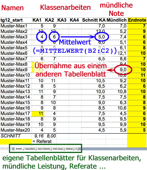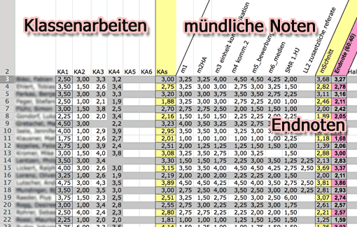 Die verschiedenen Leistungen (Klassenarbeiten, mündliche Mitarbeit ...) können auf einem einzelnen Tabellenblatt festgehalten werden. In der Praxis führt das schnell zur Unübersichtlichkeit: