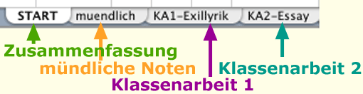 Aus Gründen der Übersichtlichkeit und der Wiederverwertbarkeit legt man pro Klasse eine Datei (in Excel: “Arbeitsmappe”) an. Das folgende einfache Beispiel zeigt ein Halbjahr einer Klasse 12 im Fach Deutsch. Natürlich sind sämtliche Ausführungen - teilweise ohne Änderungen - auf andere Stufen und Fächer übertragbar.