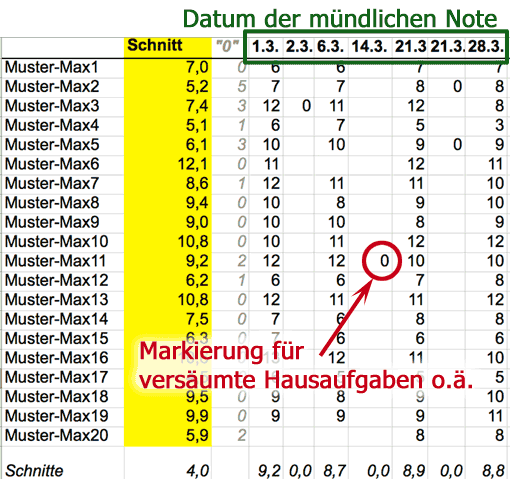 Besonders hilfreich ist ein solches Tabellenblatt, wenn Sie die mündlichen Noten nach der ICE-Methode vergeben.