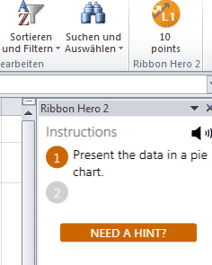 Allerdings ist Ribbon Hero 2 vollständig in englischer Sprache gestaltet; häufig muss man nachdenken, welches Menü in den Hints gemeint ist. Man muss sich darauf einstellen, dass man bei der Anweisung "Select the Design (Chart Tools) tab" auf Diagrammtools -> Entwurf (und nicht: Layout!) klickt.