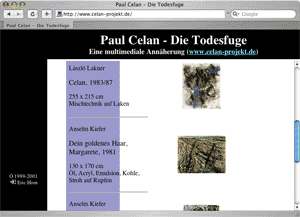 Als zusätzliches Material werden Video- und Audiodateien angeboten, die jedoch leider nicht vorhanden sind - statt dessen erhält man einen lapidaren Hinweis auf das urheberrechtliche Einschränkungen. Sehr gut gefällt hier der Bereich “Celanesque Art”, wo Kunstwerke zur Todesfuge dargestellt sind und auf Klick vergrößert werden können: