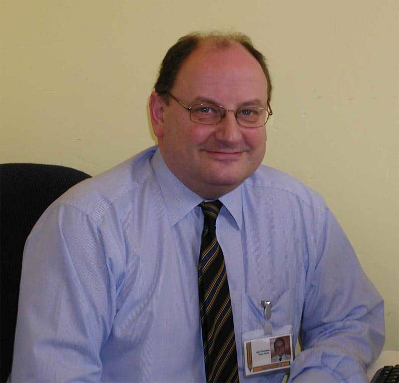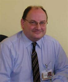 Auf dem Bild sieht man einen Mann der auf seinem Stuhl sitzt. Sehr wahrscheinlich ist er gerade bei der Arbeit. Er trägt ein blaues Hemd mit einer Hemd-Tasche wo sich sein Namenschild mit Foto befindet. Er trägt eine schwarze Krawatte mit grauen diagonalen Streifen. Er lächelt mit seinem breiten Mund. Eine Brille mit dünnen Metallrahmen sitzt auf seiner Nase und seine blaugraue Augen lugen hindurch. Er hat kurzes, braunes und glattes Haar auf seinem runden Schädel. er ist ungefähr 48 Jahre alt und ist ungefähr 169 Meter groß.