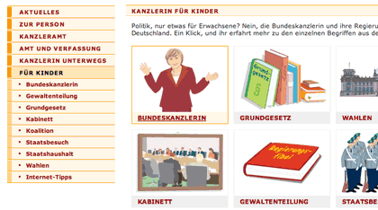 Auf der Homepage unserer Bundeskanzlerin Angela Merkel (CDU) gibt es eine Abteilung "Für Kinder", wo Kindern Grundbegriffe der Politik erklärt werden sollen. Das Angebot ist leider gründlich misslungen.