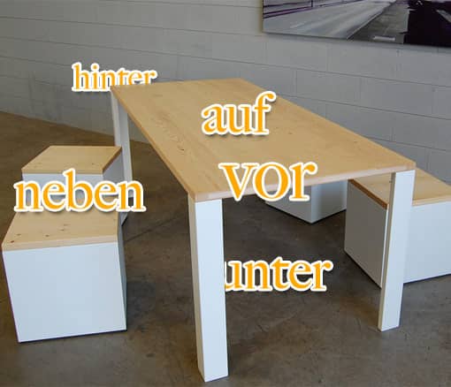 Tafelbild: Lokale Präpositionen an einem Tisch visualisiert