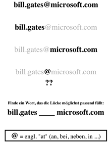 5. Aufgabe: Finde ein deutsches Wort, das die Lücke möglichst passend füllt: bill.gates____microsoft.com. Hier werden die meisten Schüler/innen eine Präposition (“bei”, “in”) oder ein Verb und eine Präposition (“arbeitet bei”) einsetzen. Nach Möglichkeit soll aber nur ein Wort eingesetzt werden, damit das Einsetzen bloßer Verben vermieden wird (“besitzt”, “hat”).