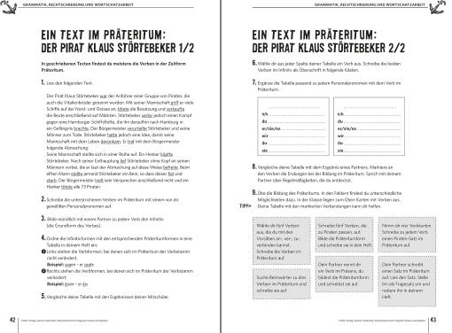 * Nimm dir vier Verbkarten. Schreibe zu jedem Verb einen Piraten-Satz im Präteritum auf.