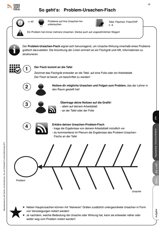 Das Arbeitsblatt "Problem-Ursache-Fisch" (PDF) stellt das Konzept und die einzelnen Arbeitsschritte in Form von Arbeitsanweisungen vor.