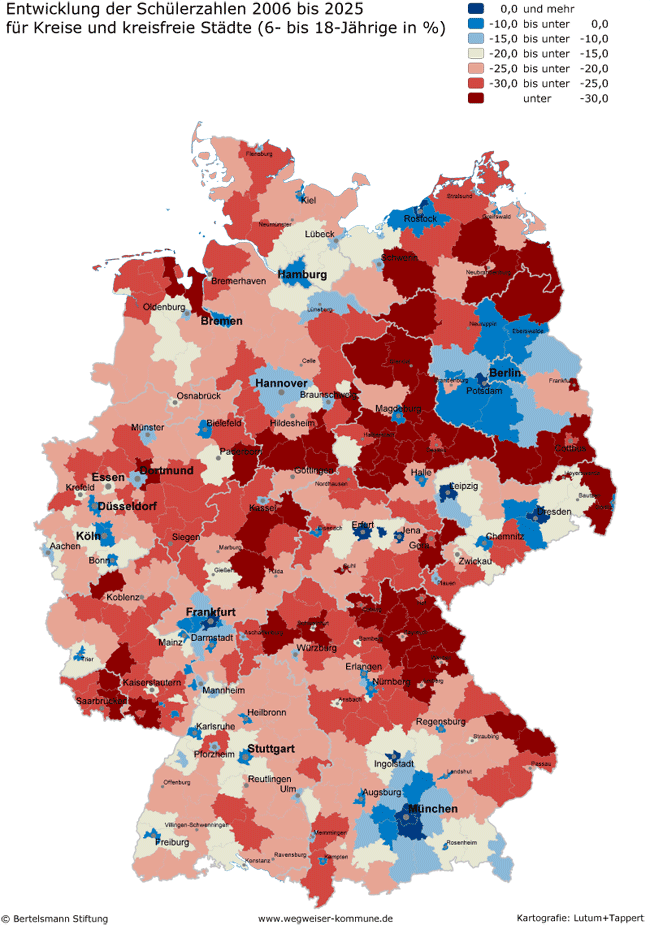 Die Bertelsmann-Stiftung veröffentlicht für die einzelnen Bundesländer und den Bund Karten, auf denen die Entwicklung der Schülerzahlen bis 2025 festgehalten ist (6- bis 18-Jährige). Sie finden die Karten für die einzelnen Bundesländer rechts neben der zugehörigen Pressemeldung.