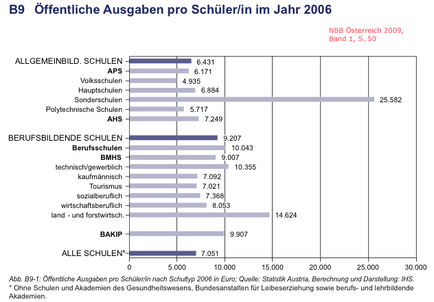 Besonders schockiert ist man in Österreich über die sehr hohen Ausgaben pro Schüler/in. derStandard.at fasst die Ergebnisse des NBB (Band 1, S. 47: Schüler/Studierende, Band 1, S. 50: Schüler nach Schulformen) so zusammen: