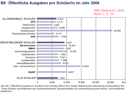 Der "Nationale Bildungsbericht" (NBB) in Österreich Jahr 2009) fasst das österreichische Bildungssystem auf knapp 700 Seiten in Statistiken und Analysen zusammen. Er zeigt u.a., dass die öffentlichen Bildungsausgaben in Österreich pro Schüler/in bei 7.051 Euro liegen - und damit deutlich über dem EU-Durchschnitt.