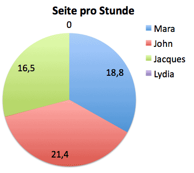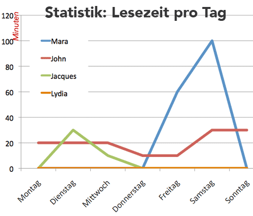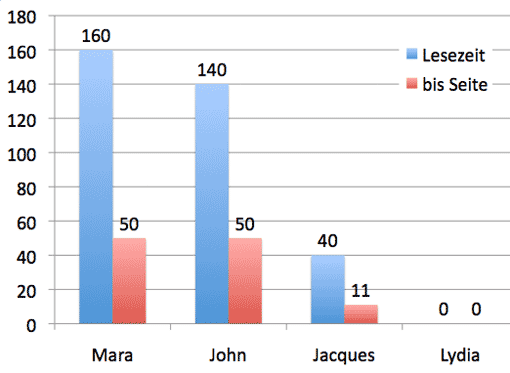 Aha! Lydia hat das Buch nicht einmal angefasst. Mara dagegen hat am Wochenende geknüppelt, typisch, sie reißt das in zwei Tagen runter. Aber sie macht das gut, ziemlich scharfsinnig. Hach, John dagegen, ein steter Charakter, hat jeden Tag fleißig 20 Minuten gelesen.