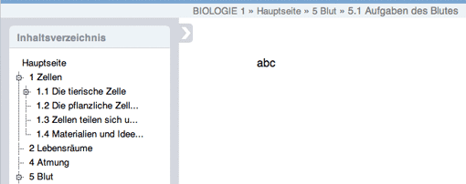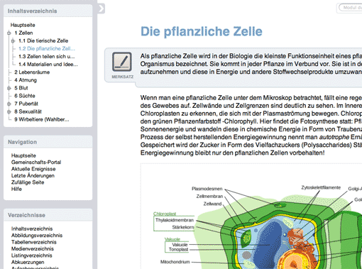 Über die Navigation ("Inhaltsverzeichnis" in der linken Leiste) kann man die einzelnen Seiten aufrufen, von denen viele allerdings noch leer sind. Ein schönes Beispiel ist "Die pflanzliche Zelle":