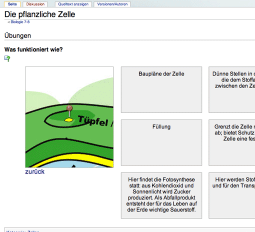 Hier ist die Seitenstruktur ebenfalls angelegt, viele Seiten aber noch leer; auf einigen finden sich bereits Übungen (z.B. eine Zuordnungsübung zur pflanzlichen Zelle, wo Begriffe auf eine Schemazeichnung gezogen werden müssen, vgl. oben den LOOP-Eintrag):