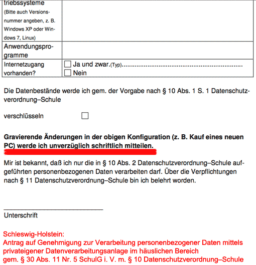 Ein typisches Beispiel ist der Antrag aus Schleswig-Holstein: Antrag auf Genehmigung zur Verarbeitung personenbezogener Daten mittels privateigener Datenverarbeitungsanlage im häuslichen Bereich gem. § 30 Abs. 11 Nr. 5 SchulG i. V. m. § 10 Datenschutzverordnung–Schule (PDF)