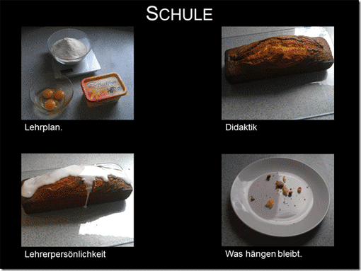 Fragen Sie zu Beginn einer Schulstunde unangekündigt die Inhalte der letzten Stunde ab. Fragen Sie unangekündigt die Inhalte ab, die Sie vor zwei Monaten behandelt haben. Das Ergebnis: Trotz ausgefeilter, von zahlreichen Profis entwickelter Bildungspläne, trotz moderner Didaktik, trotz vollem Einsatz der Lehrer/in bleiben nur ein paar Brösel hängen. Offensichtlich gilt das auch andersrum - wenn wir mit miesen Zutaten schlecht backen, steht hinterher doch ein schöner Kuchen auf dem Teller: