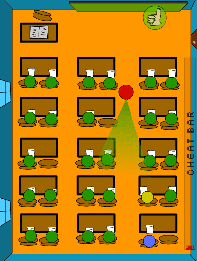 Was bei unserer verdeckten Recherche auffiel: Auf den einschlägigen Seiten wird sehr häufig betont, wie wichtig die Wahl des Sitzplatzes ist - nämlich möglichst weit hinten und möglichst unzugänglich. Damit beschäftigt sich übrigens auch dieses (etwas doofe) Spiel. Der blaue Schüler muss vom gelben abschreiben, während die Lehrer/in durch die Reihen streift. Je weiter hinten man sitzt, desto einfacher wird das.