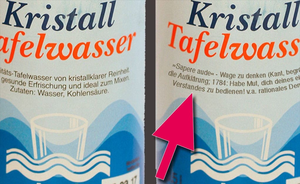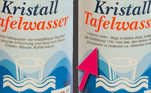 Funktioniert so wie die bedruckte Tafel Schokolade: (Möglichst buntes) Etikett einer Getränkeflasche mit Wasser einweichen und von der Flasche lösen. Trocknen lassen, einscannen und mit einer Bildbearbeitungssoftware den Spick-Text einbauen. Etikett wieder aufkleben. Beispiel z.B. im Spickfilm.