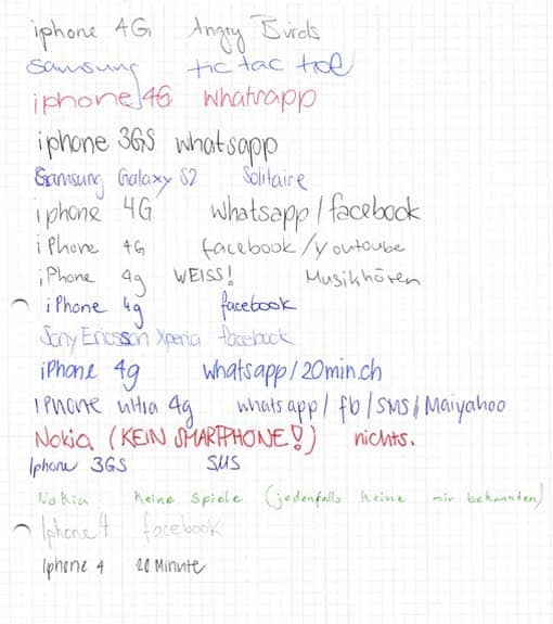 Dass 12 der 17 Auskunftswilligen ein iPhone besitzen, ist wesentlich uninteressanter als die ausgeübten Tätigkeiten. Grob zusammengefasst (ges. 17 Angaben, teilweise Mehrfachnennungen):