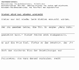 Als ich einmal beim Essen war, sah ich, dass viele Schüler, die vor Geschäften stehen bleiben, ein Handy besitzen. Ich weiß, dass diese Neuigkeit mich nicht bekannt machen wird, aber es ist ja nur ein Diktat, das dem Üben dient. Beim Diktieren ist es nicht wichtig, dass es einen Sinn ergibt. Es ist viel wichtiger, dass Diktate, die den Schülern helfen, die Rechtschreibung, die so schwierig ist, kennen zu lernen, schwierig sind, obwohl Rechtschreiben ja eigentlich ziemlich einfach ist. Egal. Jetzt wollen wir spazieren gehen.