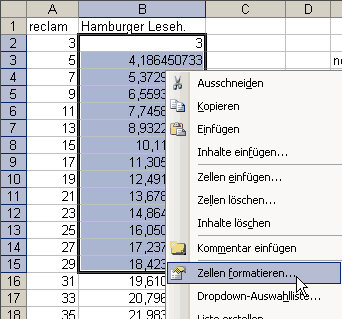 7. Um die krummen Werte zu eliminieren, müssen Sie die Zellen formatieren. Markieren Sie alle relevanten Zellen und klicken Sie mit der rechten Maustaste drauf. Wählen Sie aus dem erscheinenden Kontextmenü “Zellen formatieren”: