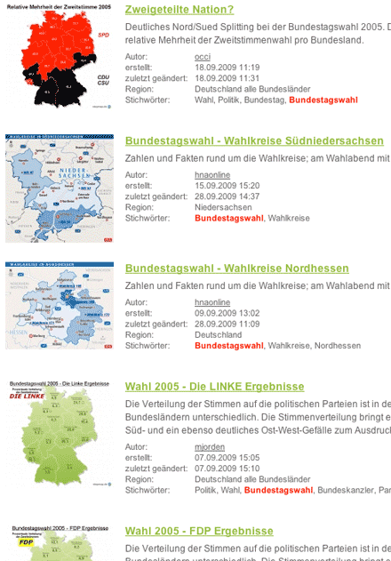 So gibt es für den Gemeinschaftskunde-/Politikunterricht einige Karten zu den Ergebnissen der Bundestagswahlen (v.a.) 2005 und 2009 (z.B. relative Mehrheit der Zweitstimmen pro Bundesland, Ergebnisse einzelner Parteien im Ländervergleich), die Standorte der aktiven Kernkraftwerke in Deutschland (mit Informationen zu den einzelnen Kernkraftwerken) oder verschiedene demographische Karten.