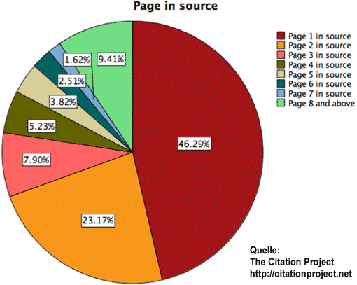 Unabhängig vom Umfang der zitierten Quellen sind 46% aller Zitate der ersten Seite entnommen; von der zweiten Seite sind 23% aller Zitate entnommen. 77% aller untersuchten Zitate finden sich auf den ersten drei Seiten der Quelle, unabhängig davon, ob die Quelle insgesamt drei oder 400 Seiten umfasst. Verwenden die Studierenden umfangreichere Quellen, wird ebenfalls sehr häufig aus den ersten Seiten zitiert; nur 9% der Zitate stammen von Seite 8 oder höher.