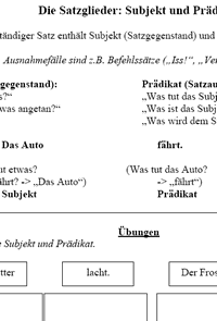 Erklärung der Satzglieder "Subjekt" und "Prädikat", außerdem einige Übungen auf dem Arbeitsblatt und Hinweise zur Durchführung dieser Übungen im Deutschunterricht. Niveau Sek I/berufliche Schulen.