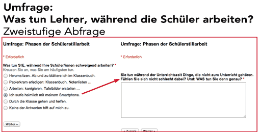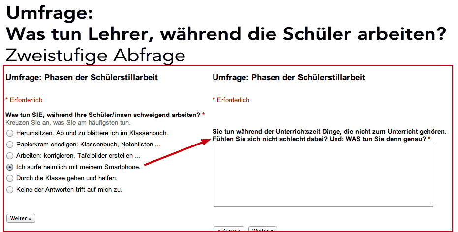 Unter diesem Beitrag war ein kleines Umfrageformular veröffentlicht, das zweistufig abfragte, was die Lehrer/innen in Phasen der Schüleraktivität tun: