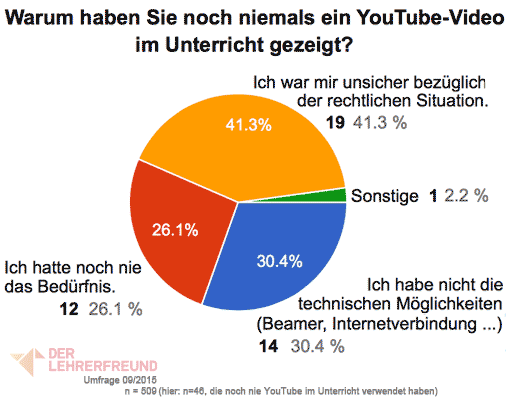 Diese Zahlen sind recht niedrig, wenn man bedenkt, wie viele Juwelen für den Unterricht YouTube beherbergt - historische Dokumentationen, aktuelle Nachrichten und Analysen, wissenschaftliche Sendungen und Animationen, Interviews, fremdsprachliche Produktionen usw. Der Grund für die niedrige Nutzungsfrequenz ist wahrscheinlich weniger im Gesetzesbewusstsein der Lehrer/innen zu suchen (s.u.) als in der mangelnden technischen Ausstattung an vielen Schulen. Wer hat schon einen laufenden Rechner + Beamer + Internetzugang im Klassenzimmer oder eine alternative Infrastruktur (Tablet + Beamer o.ä.). Bei der ICILS-Studie 2013 war Deutschland das weltweite Schlusslicht, was IT-Ausstattung betrifft (!).
