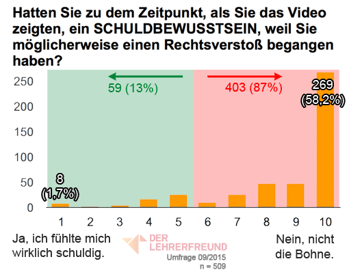 Ein Blick aufs Diagramm zeigt: Das Schuldbewusstsein hält sich wirklich in Grenzen, man könnte sogar sagen: Ein Großteil der Lehrer/innen hat keinerlei Schuldgefühle beim Zeigen von YouTube-Videos im Unterricht.
